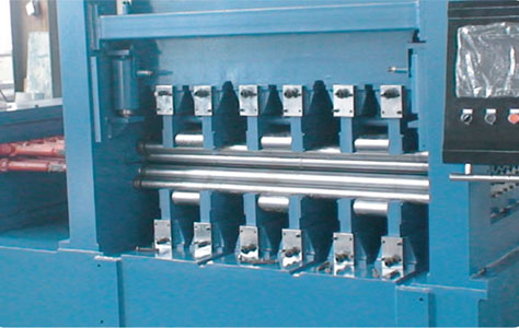 本机床是四重式校平机的升级机型。在上、下排校平工作辊与支撑辊(轮)之间各加装进一排中间辊,构成上下各三重,共六重的组辊结构。通过中间辊的过渡,支撑辊(轮)的支撑力不直接作用于工作辊,避免了四重式校平机工作时,在敏感材料表面留下支撑辊(轮)压痕的现象,最大程度地保护加工材料的表面状态。主要用于校平铝板、不锈钢板、铜板、有色金属板、不同金属复合板,涂、镀、磨工艺金属板等对板表面要求较高的板材。校平辊受